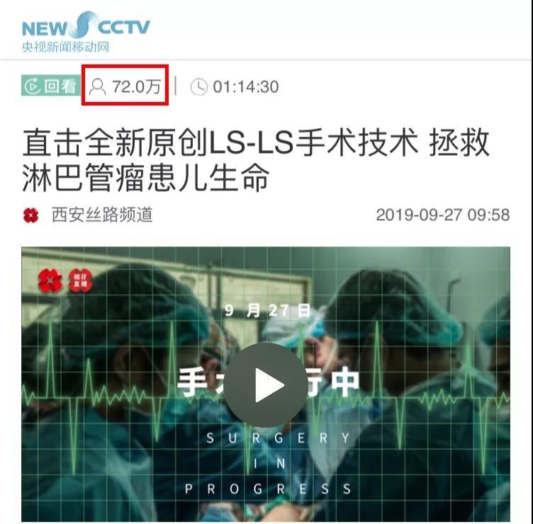 開診后的第一個手術(shù)日,西安電視臺全程直播了全新原創(chuàng)LS-LS手術(shù)技術(shù)拯救淋巴管瘤患兒生命的手術(shù)過程!央視新聞移動網(wǎng)、今日頭條客戶端、廣東廣播電視臺觸電新聞、西安網(wǎng)微博等同步播出西安國際醫(yī)學中心骨科醫(yī)院拯救淋巴管瘤患兒的全過程。據(jù)不完全統(tǒng)計,在線觀看直播達百萬,僅央視新聞移動網(wǎng)的觀看量達72萬!