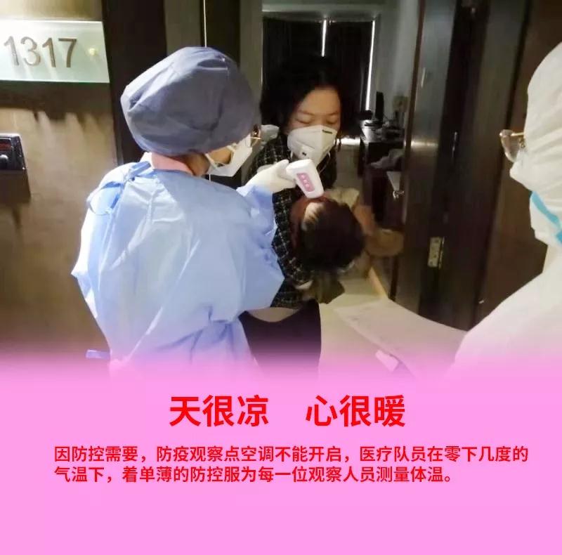 這支醫(yī)療隊(duì)由3名醫(yī)生、5名護(hù)士組成,分別是房武寧、張曉敏、王婧3位醫(yī)生;護(hù)士為白容容、陳蕓、王亞馨、燕瑞娥、田橋。身穿不透氣的防護(hù)服,醫(yī)護(hù)人員時(shí)時(shí)刻刻與時(shí)間拼耐心、與疫情變化拼細(xì)心。留觀人員中有16名70歲以上的老人,6名3歲以下的兒童。他們體質(zhì)較弱,需要更多的關(guān)懷與呵護(hù)。護(hù)士王亞馨每天要在樓上往返7、8趟為他們測體溫、安撫情緒?!拔乙矔r(shí)常想念家人,春節(jié)沒法和他們一起過年?,F(xiàn)在,這里的老人和孩子就是我的家人。”正說著,豆大的汗珠順著她的眼睫毛滑落。即便超負(fù)荷工作著,她也從未喊過苦叫過累。