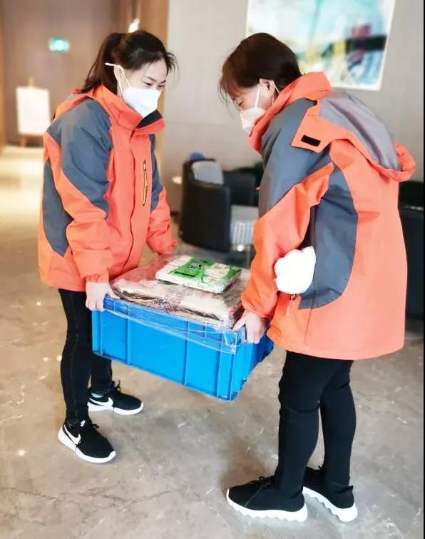 統(tǒng)一分發(fā),把飯菜送到每個房間。為了避免人員密集,駐地各樓層負(fù)責(zé)人會將飯菜從一樓集中運(yùn)送至各樓層并分發(fā)到每個人房間門口的床頭柜上。并及時通知大家食用。但由于駐地工作任務(wù)多,節(jié)奏快,很多隊(duì)員不能及時就餐,細(xì)心的姑娘們會定時檢查取餐情況,及時為隊(duì)員熱上可口的飯菜。用餐后半個小時后,她們又及時將垃圾進(jìn)行整理運(yùn)輸?shù)骄频觊T口右邊的垃圾暫存點(diǎn)。