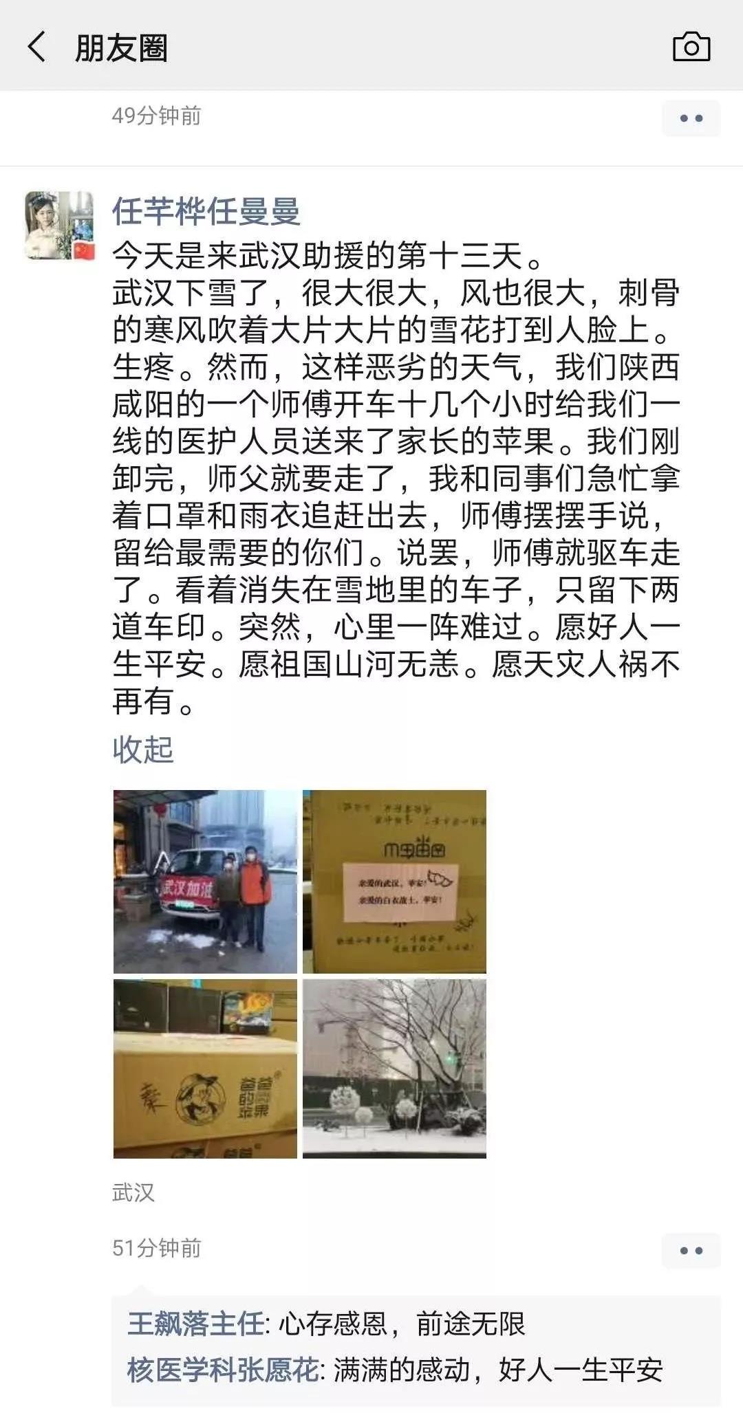 任曼曼久久不能平靜,在朋友圈里寫到:今天是來武漢援助的第十三天。武漢下雪了,很大很大,風(fēng)也很大,刺骨的寒風(fēng)吹著大片大片的雪花打到人臉上,生疼。然而,這樣惡劣的天氣,我們陜西咸陽的一個(gè)師傅開車十幾小時(shí)給我們一線的醫(yī)護(hù)人員送來了家鄉(xiāng)的蘋果。我們剛卸完,師傅就要走了,我和同事們急忙拿著口罩和雨衣追趕出去,師傅擺擺手說給最需要的你們。說罷,師傅就驅(qū)車走了??粗г谘┑乩锏能囎?,只留下兩道車印。突然,心里一陣難過。愿好人一生平安,愿祖國山河無恙,愿天災(zāi)人禍不再有!