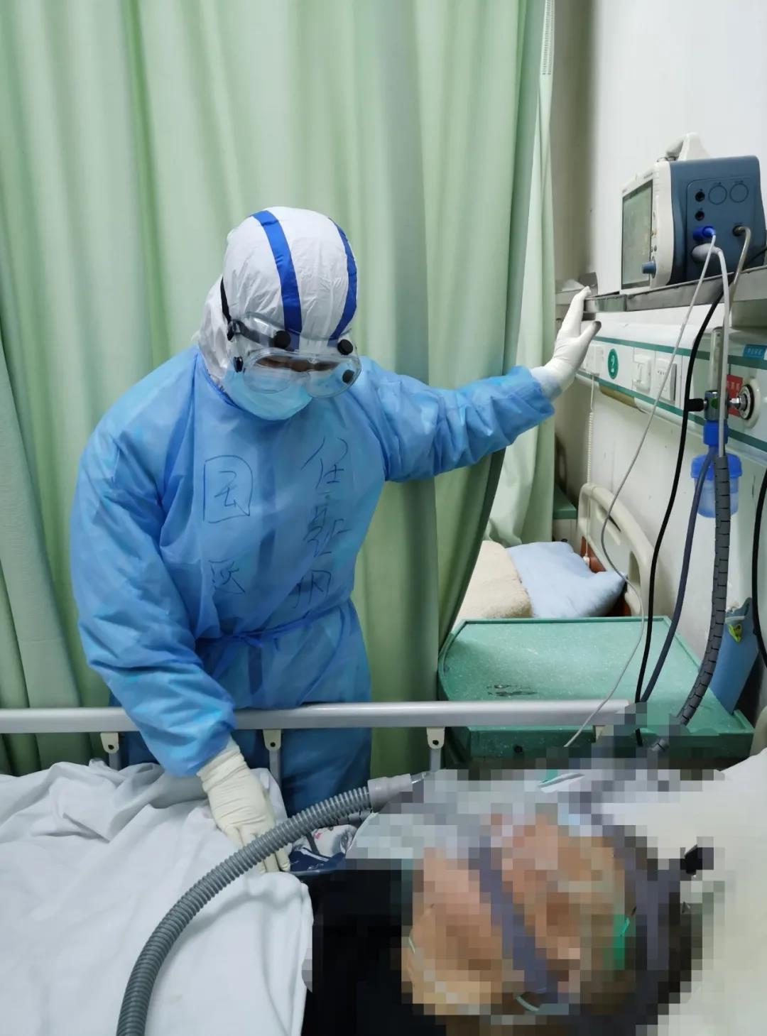 凌晨1點(diǎn)多,一位84歲的老人,確診為陽性,無尿,四肢冰冷,使用呼吸機(jī)。我們迅速補(bǔ)液,并用手套自制的暖水袋給予保暖,同時(shí)不停地喊著:“爺爺,爺爺,不能放棄,加油,我們陪在你的身邊,一起和病毒做斗爭!”他好像能聽得見我們說話,微微地動(dòng)了一下頭,眼角濕潤了。