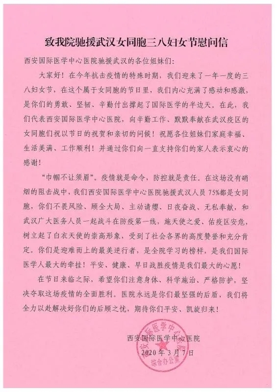 “疫”線有我,做“逆行先鋒”。疫情發(fā)生正值春節(jié)假期,西安國際醫(yī)學(xué)中心醫(yī)院從全面部署防控工作到建立聯(lián)防聯(lián)控工作機(jī)制,從醫(yī)療隊員火速馳援到醫(yī)療物資緊急保障,從正式進(jìn)駐武漢第八醫(yī)院和隨州市中心醫(yī)院到全面接收新冠患者……都有女隊員們不懼危險、日夜奮戰(zhàn),同時間賽跑,與病魔較量的身影。2月2日,接陜西省衛(wèi)健委馳援武漢的指令,5個小時,1000余名女醫(yī)護(hù)人員主動請纓,遞交了請戰(zhàn)書、紅手印。腫瘤醫(yī)院副院長薛妍教授、感控部主任劉冰、總護(hù)士長倪曉慧等醫(yī)護(hù)人員舍小家、為大家,迅速出擊、臨危不懼,不計名利、不顧生死,于2月3日搭乘包機(jī)到達(dá)指定地點(diǎn),令人肅然起敬,令人敬佩感動。