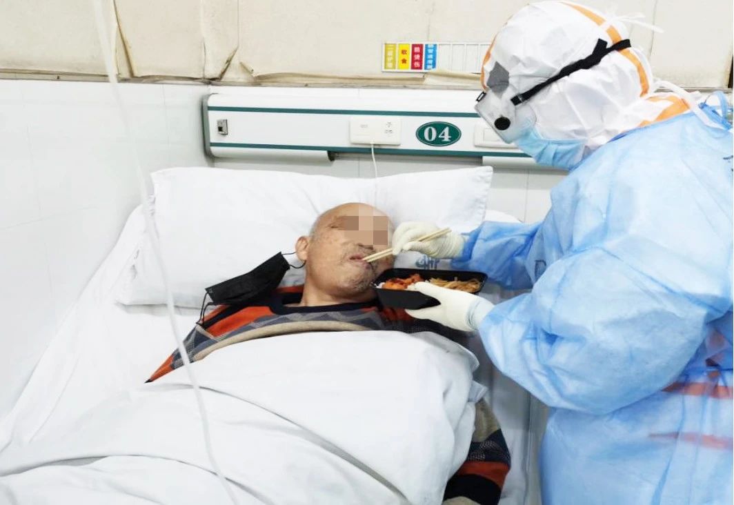 一名從敬老院轉(zhuǎn)來(lái)的老爺爺,入院第一天精神狀態(tài)不好,護(hù)士長(zhǎng)給他喂飯還容易嗆咳。第二天,我們一起去給老爺爺喂飯,陪他聊天,老爺爺吃了一份盒飯,對(duì)我們說(shuō):“謝謝你們!你們一定要保護(hù)好自己,我們最大的愿望就是你們可以平安回家!”我沒(méi)控制住自己的眼淚。