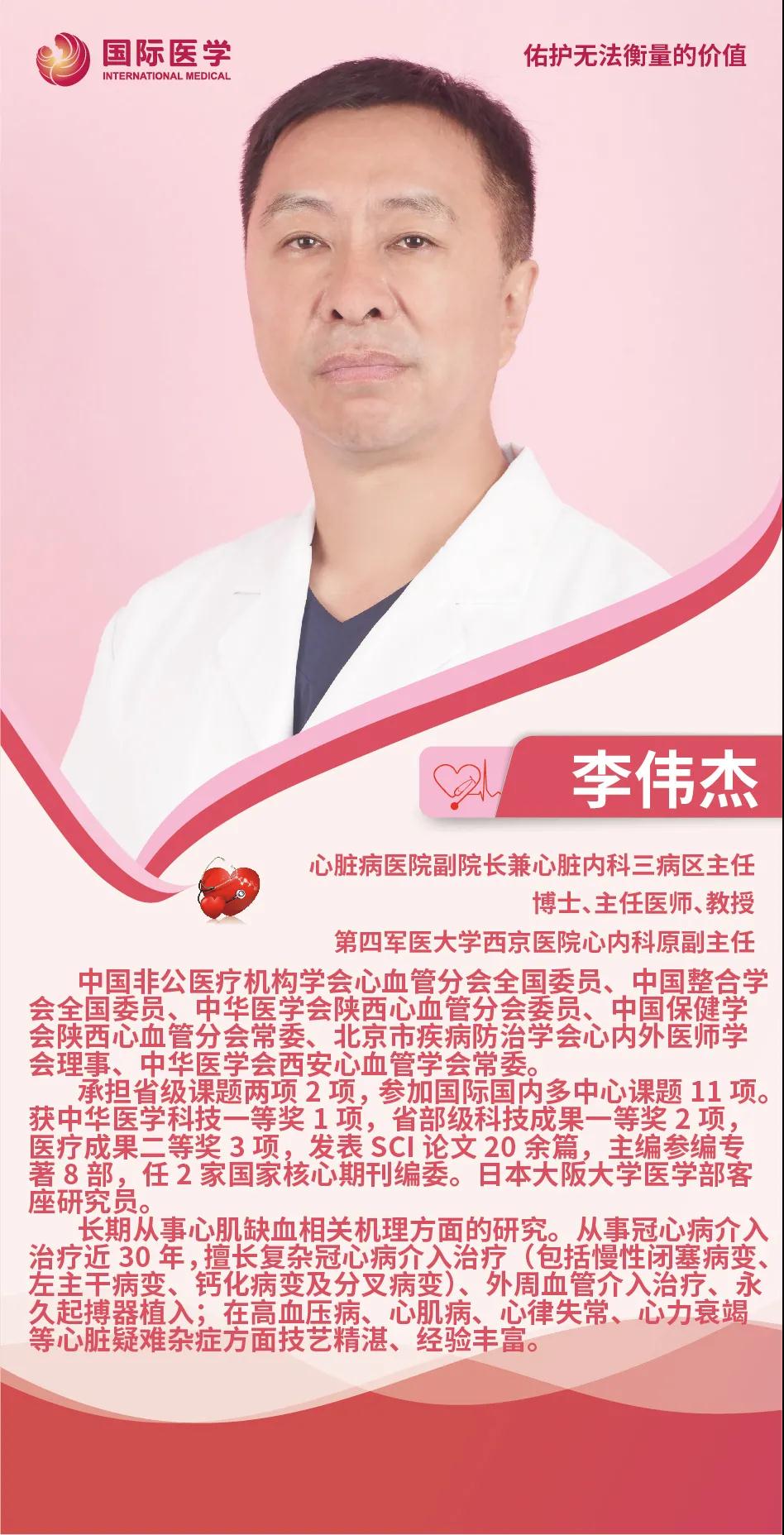 李偉杰,第四軍醫(yī)大學(xué)西京醫(yī)院心內(nèi)科原副主任,博士、主任醫(yī)師、教授。先后承擔(dān)了多項(xiàng)國際國內(nèi)及省部級課題,獲得過中華醫(yī)學(xué)科技一等獎(jiǎng)等多重獎(jiǎng)項(xiàng),長期從事于血管管介入治療,擅長冠心病復(fù)雜病變的介入手術(shù)治療,包括慢性閉塞病變、左主干病變、鈣化病變及分叉病變,在外周血管的介入治療級其他心血管疾病的診療方面具有非常豐富的經(jīng)驗(yàn)。李偉杰在西京醫(yī)院工作多年,掛號一票難求,因和藹可親的態(tài)度、精湛的醫(yī)技、崇厚的醫(yī)德獲得了一大批的患者“粉絲”,是患者口中的明星醫(yī)生,醫(yī)生口中的業(yè)界“男神”。