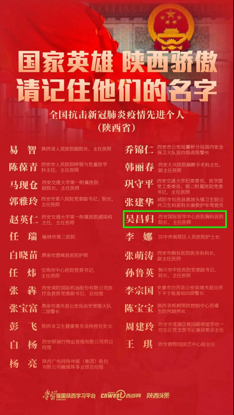 吳昌歸表示,受到黨和國家的表彰,聆聽了總書記的講話,我非常激動。這份榮譽不僅是對個人的褒獎,更是對西安國際醫(yī)學(xué)330名抗疫英雄的肯定!作為一名老軍人、老黨員、呼吸專業(yè)的老醫(yī)生,在這場戰(zhàn)疫中,我深深感受到了社會主義制度的無比優(yōu)越,真正感悟到“沒有共產(chǎn)黨就沒有新中國”的深刻內(nèi)涵。