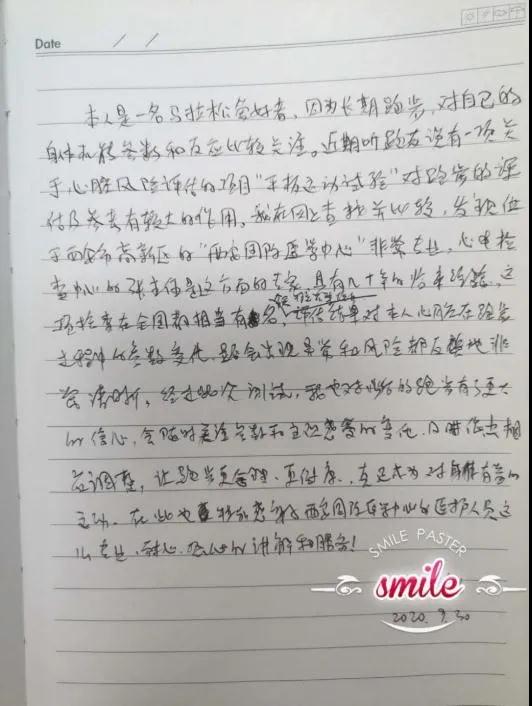 “本人是一名馬拉松愛好者,因為長期跑步對自己的身體機能參數(shù)和反應比較關注,近期聽朋友說有一項關于心臟風險評估的項目。我在網(wǎng)上查找并比較發(fā)現(xiàn),平板運動試驗對跑步的評估及參數(shù)有較大的作用,西安國際醫(yī)學中心醫(yī)院非常專業(yè),心電檢查中心的張錄興主任是這方面的專家,具有幾十年的臨床經(jīng)驗,這項檢查在全國都相當有名。今天通過這項檢查評估結(jié)果,對心臟在跑步過程中的參數(shù)變化,是否會出現(xiàn)異常和風險,都反饋得非常清晰,經(jīng)過這次測試后,我也對今后的跑步有了更大的信心,會隨時關注參數(shù)和主觀感受的變化,日后會做出相應的調(diào)整,讓跑步更合理,更健康,真正地成為對身體有益的運動,在此也非特別感謝西安國際醫(yī)學中心醫(yī)護人員這么專業(yè)、耐心熱情的講解和服務?!?