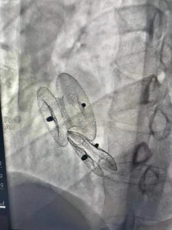 在詳細了解患者病情,仔細閱讀患者影像資料后,曾廣偉主任已經(jīng)有了清晰的手術(shù)策略。在精心的準備和團隊的配合下,曾主任順利的利用兩個封堵器對房缺進行了封堵。