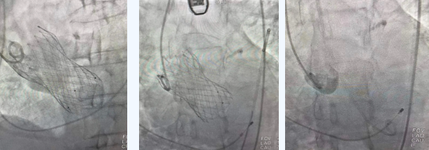 術(shù)中,曾廣偉主任團(tuán)隊(duì)高效配合,完成了特定時(shí)間點(diǎn)起搏心臟、臨時(shí)短時(shí)間關(guān)閉呼吸機(jī)、降低主動脈瓣阻力、快速釋放瓣膜等一系列高難度操作,有效保證瓣膜精準(zhǔn)釋放。瓣膜釋放經(jīng)TEE確認(rèn),主動脈瓣膜釋放位置佳,經(jīng)豬尾導(dǎo)管造影,主動脈瓣返流即刻消失,且無瓣周瘺。
