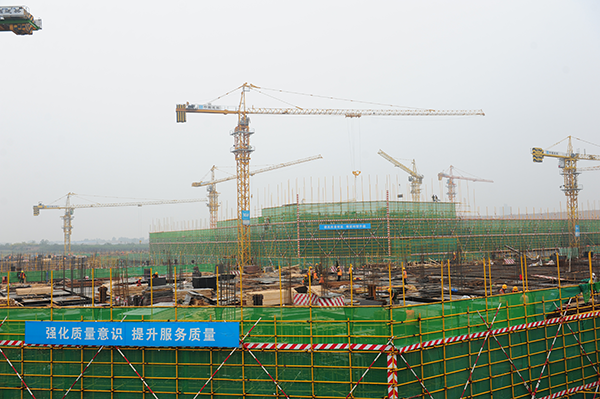 隨后李毅一行在史總帶領下,來到工地現(xiàn)場的二層觀景平臺,面對規(guī)模宏大,塔吊林立的建筑現(xiàn)場,看到項目整體浮出地面,中心醫(yī)技樓已建至二層,李書記對項目建設進度表示驚喜,同時對建設管理表示肯定。期間,史總結(jié)合施工現(xiàn)場和效果圖為李書記詳細介紹了國際醫(yī)學城的建設架構(gòu),功能劃分等情況,之后還就規(guī)劃建設的“一心兩翼 天使之城”健康中國小鎮(zhèn)的設計理念,“五位一體”功能布局等做了詳細介紹和說明。