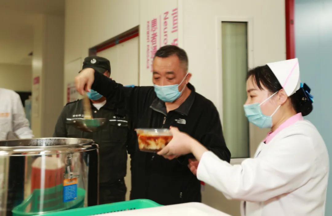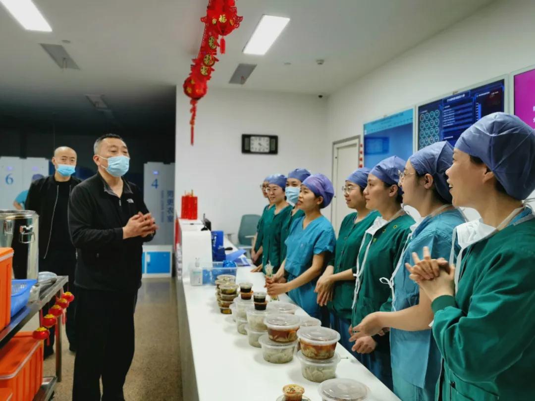 “餃子出鍋了!大家辛苦了!都來吃餃子!”剛出鍋的餃子冒著熱氣,香味彌漫在醫(yī)生辦公室、護士站。接到熱騰騰的餃子,重癥醫(yī)學(xué)科醫(yī)生張永樂迫不及待地咬了一口,牛肉大蔥餡正是他的最愛?!斑x擇了醫(yī)學(xué)就意味著奉獻,看著醫(yī)院的年味越來越濃,病區(qū)里的患者一個個好轉(zhuǎn),病區(qū)患者慢慢變少,我還是挺有成就感的?!睆堄罉沸χf。