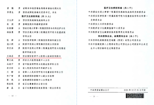 近期,中共陜西省委印發(fā)《關(guān)于表彰全省優(yōu)秀共產(chǎn)黨員和全省先進基層黨組織的決定》,對在抗擊新冠肺炎疫情中涌現(xiàn)出來的134名優(yōu)秀共產(chǎn)黨員和45個先進基層黨組織進行了表彰。西安國際醫(yī)學(xué)中心醫(yī)院心臟病醫(yī)院院長王海昌被評為“陜西省優(yōu)秀共產(chǎn)黨員”。