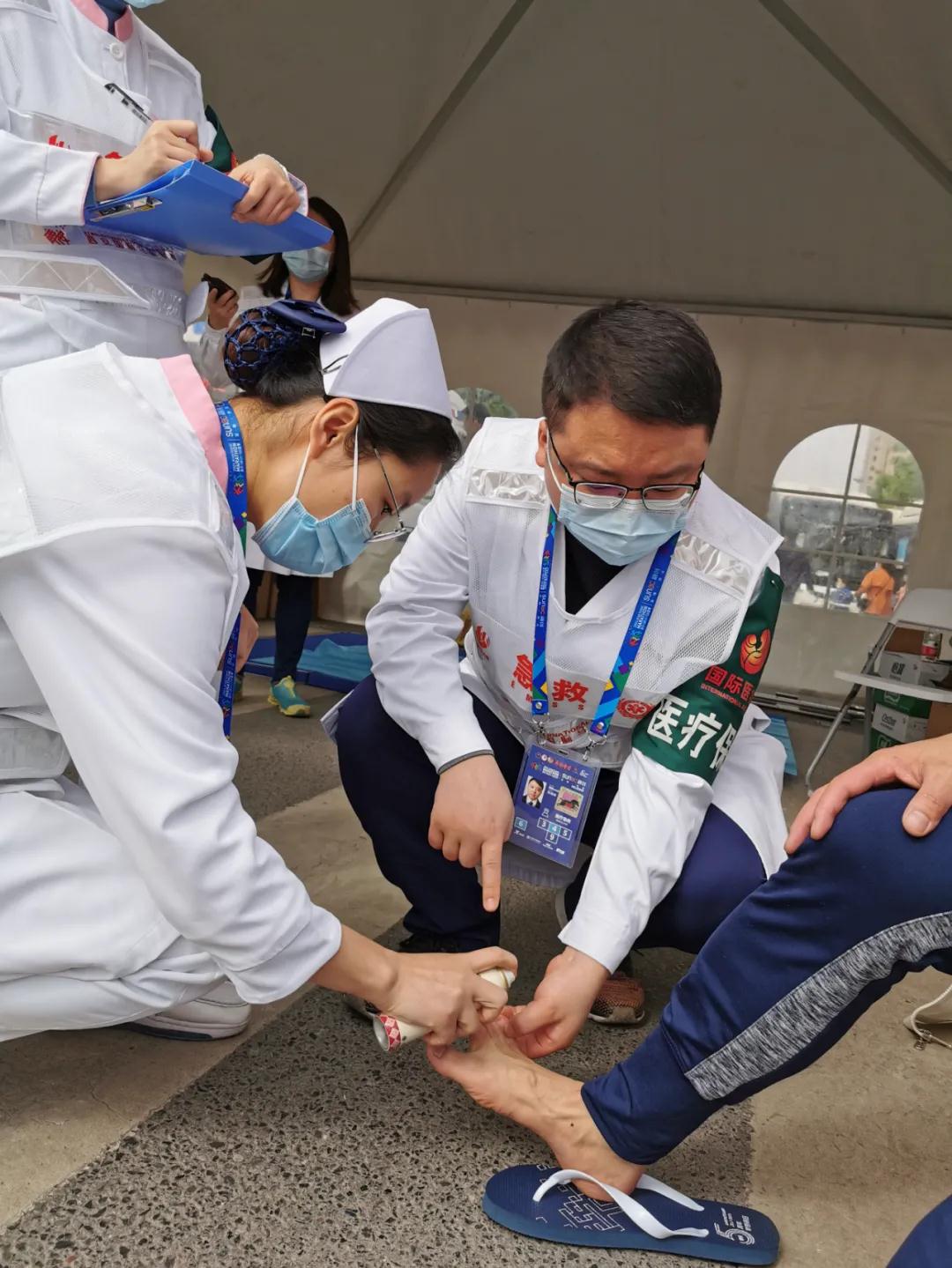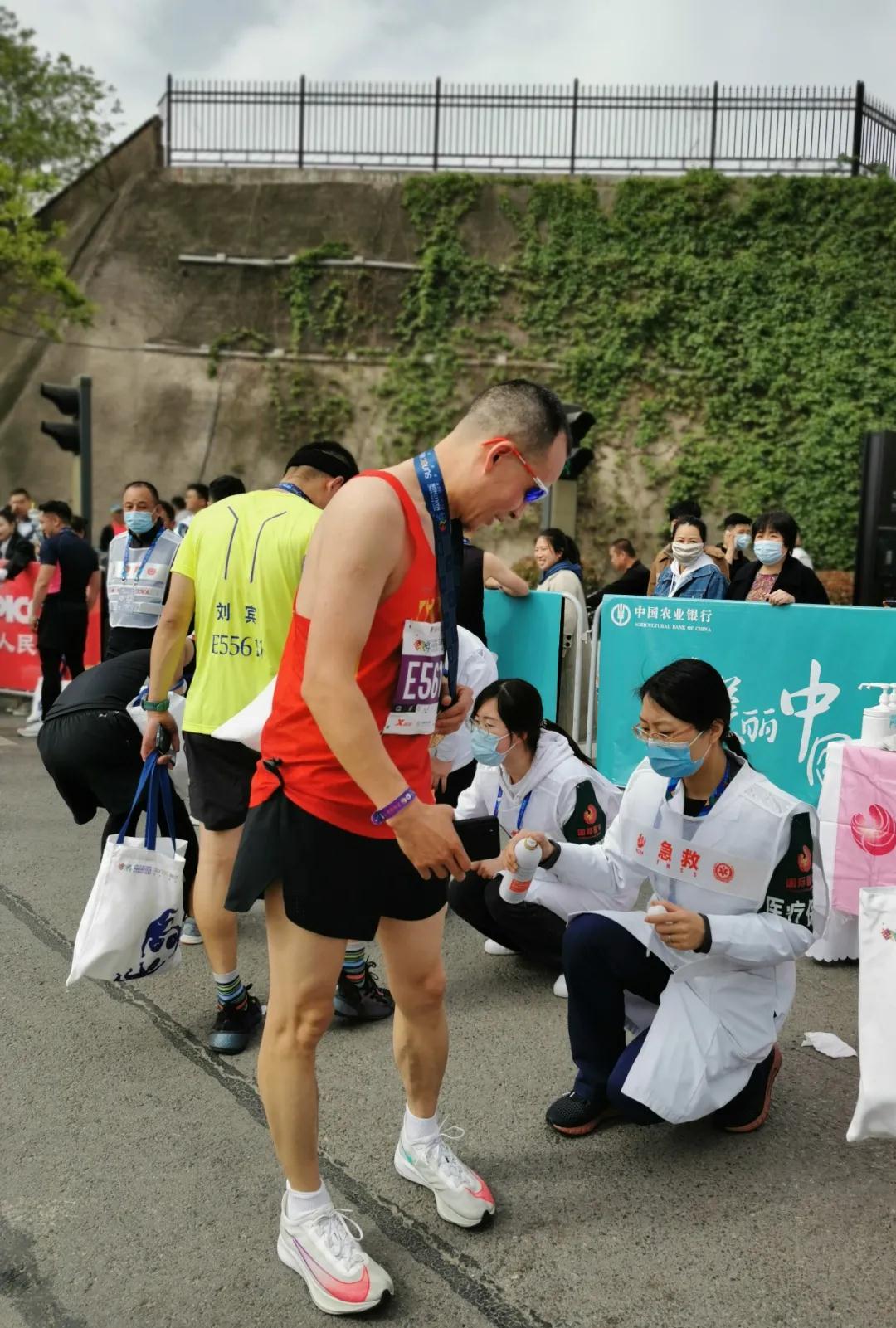 “醫(yī)生,我扭傷了腳踝,麻煩幫忙看看”,“護(hù)士,麻煩噴一些運(yùn)動(dòng)冰肌噴”……9點(diǎn)開始,奔跑大軍陸續(xù)抵達(dá),涂抹凡士林、提供糖鹽水、處理扭傷抽筋等醫(yī)療需求均得到回應(yīng),醫(yī)護(hù)人員各司其職,對(duì)運(yùn)動(dòng)員開展巡回指導(dǎo)和賽后恢復(fù)工作。