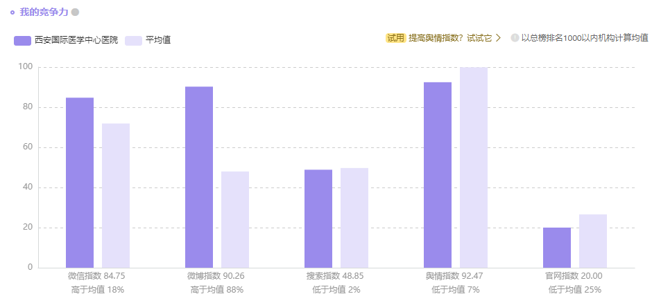 丁香園收錄了全國2000 醫(yī)院的品牌指數(shù),其中包括公立醫(yī)院與非公立醫(yī)院。榜單顯示:西安國際醫(yī)學中心醫(yī)院綜合排名第19名(較上周上升36個名次);醫(yī)院品牌指數(shù)68.79;微信指數(shù);84.75(高于平均值18%);微博指數(shù)90.26(高于平均值88%);搜索指數(shù)48.85(高于平均值2%);官網(wǎng)指數(shù)20(低于均值25%);輿情指數(shù)92.47(低于均值7%,正面輿情>負面輿情)。