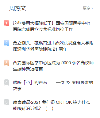 西安國際醫(yī)學中心醫(yī)院微信公眾號發(fā)布的《這些費用大幅降低了!西安國際醫(yī)學中心醫(yī)院完成醫(yī)療收費標準切換工作》《西安國際醫(yī)學中心醫(yī)院為9000余名高校師生接種新冠疫苗》《傾聽心的聲音——一位22歲患者講的故事》3篇文章入選丁香園丁香號的一周熱文榜單前五名。