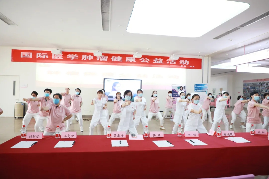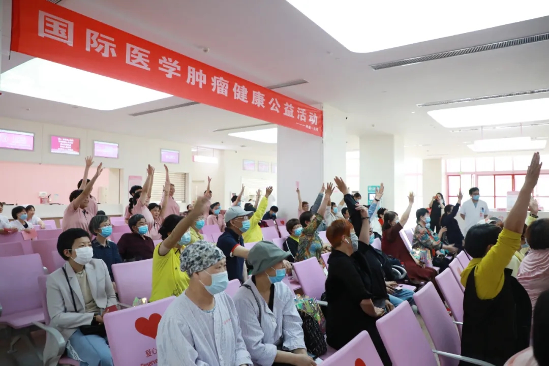 腫瘤一病區(qū)的醫(yī)護(hù)人員和志愿者們共同演練了一段八段錦,隨后的健康知識(shí)問答和歌曲快閃環(huán)節(jié)將活動(dòng)氛圍推向高潮,大家爭(zhēng)先恐后地舉手搶答,現(xiàn)場(chǎng)問答也促進(jìn)了對(duì)于腫瘤防治、康復(fù)知識(shí)的推廣。最后,大家合唱歌曲“相信我們會(huì)創(chuàng)造奇跡”,積極、歡樂的氛圍縈繞不息。活動(dòng)最后,薛妍副院長(zhǎng)、劉樹松教授和張俊美醫(yī)生對(duì)患者的提問進(jìn)行了耐心、細(xì)致的解答。