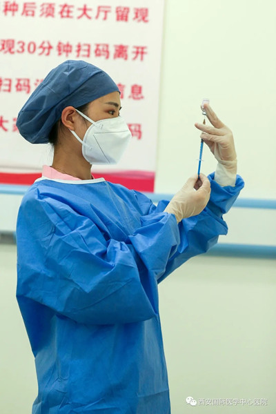 掃碼,拆開包裝,取出疫苗,拿出一次性針頭,扎進瓶中,抽出液體,注射到接種對象胳膊上……今天的這位接種者,是西安國際醫(yī)學(xué)中心醫(yī)院護士楊婕接種的第13230人。