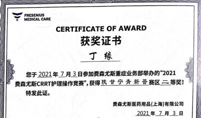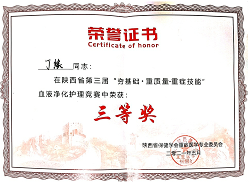 2021年5月,陜西省保健學(xué)會(huì)重癥醫(yī)學(xué)專業(yè)委員會(huì)舉辦了第三屆《“夯基礎(chǔ)?重質(zhì)量-重癥技能”血液凈化護(hù)理技能競(jìng)賽》。丁緣經(jīng)過激烈角逐,從陜西省21家醫(yī)院的24名選手中脫穎而出,榮獲三等獎(jiǎng),拿到了全國聯(lián)賽的入場(chǎng)券。