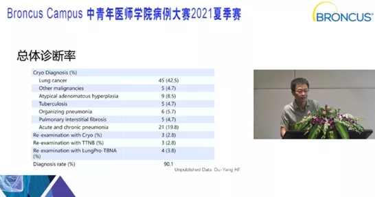 據(jù)歐陽(yáng)海峰介紹,本次參評(píng)病例是一項(xiàng)單中心隊(duì)列研究的病例數(shù)據(jù)。部分肺部結(jié)節(jié)、肺部包塊患者存在診斷困難的問(wèn)題?;颊咔捌谠诙嗉裔t(yī)院行氣管鏡檢查,均無(wú)法明確診斷。通過(guò)歐陽(yáng)海峰團(tuán)隊(duì)LungPro導(dǎo)航 超細(xì)MP290F支氣管鏡 1.1mm冷凍探針 rEBUS的TBCB術(shù)式,診斷率高達(dá)90%以上。對(duì)于仍無(wú)法明確診斷的少部分病例,通過(guò)BTPNA、LungPro-TBNA、TTNB等術(shù)式也獲得了明確診斷。經(jīng)文獻(xiàn)檢索,此項(xiàng)研究是該術(shù)式的首次報(bào)道。目前,困難取材的肺部及縱隔疾病是歐陽(yáng)海峰團(tuán)隊(duì)主要病種之一,也是引領(lǐng)性特色技術(shù)之一。