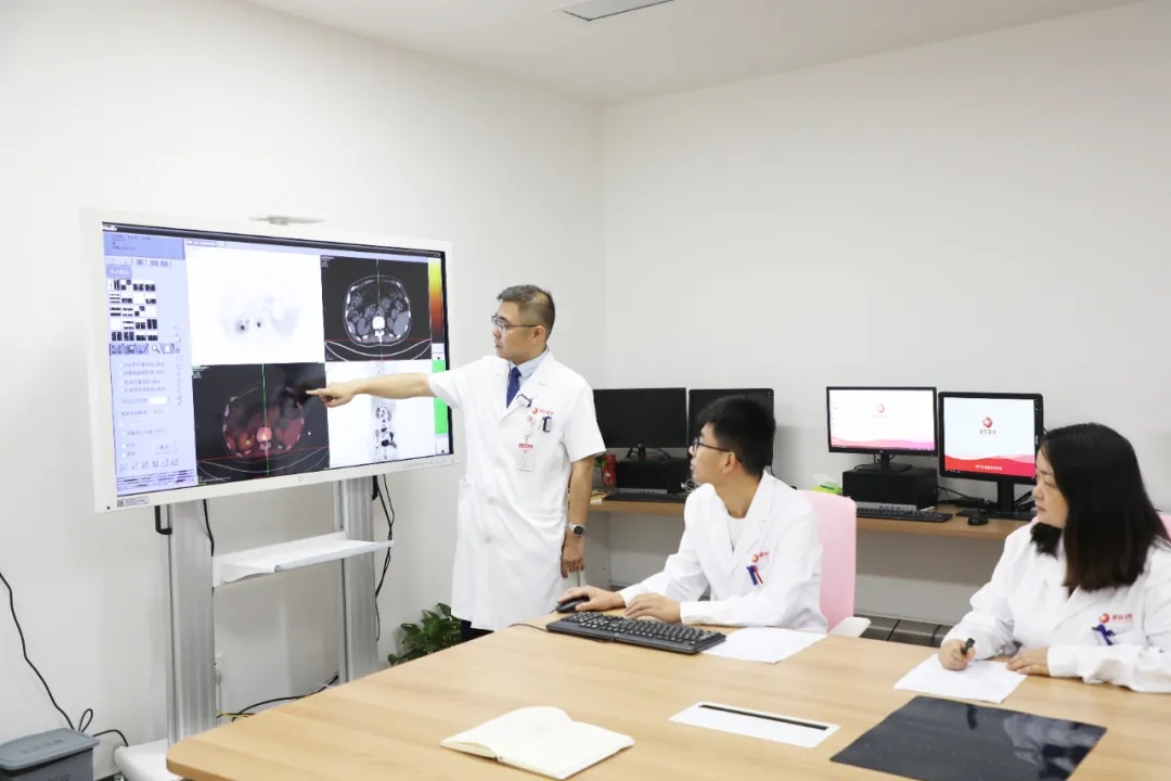 在這個占地4100多平方米的核醫(yī)學(xué)科檢查區(qū)及病區(qū),王喆帶領(lǐng)團(tuán)隊開展腫瘤及骨骼、甲狀腺、心臟、腎臟、呼吸、消化等系統(tǒng)的核醫(yī)學(xué)檢查項目,借助PET/CT、SPECT/CT、運(yùn)動負(fù)荷心肌灌注顯像監(jiān)護(hù)儀、肺通氣氣體發(fā)生器等先進(jìn)設(shè)備進(jìn)行檢查,針對甲狀腺相關(guān)疾病,如甲亢、分化型甲狀腺癌術(shù)后進(jìn)行碘131治療、腫瘤骨轉(zhuǎn)移核素治療、磷32治療血管瘤等做相關(guān)診療。
