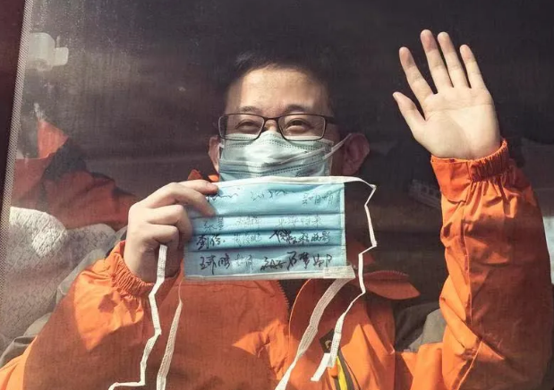 攝影作品《醫(yī)生》內(nèi)容為2020年2月3日,西安國(guó)際醫(yī)學(xué)中心醫(yī)院赴武漢醫(yī)療隊(duì)的出征現(xiàn)場(chǎng),一位即將出發(fā)的醫(yī)生展示寫(xiě)滿(mǎn)科室同事名字和祝福的口罩。該作品由西安報(bào)業(yè)集團(tuán)攝影記者竇翊明拍攝。