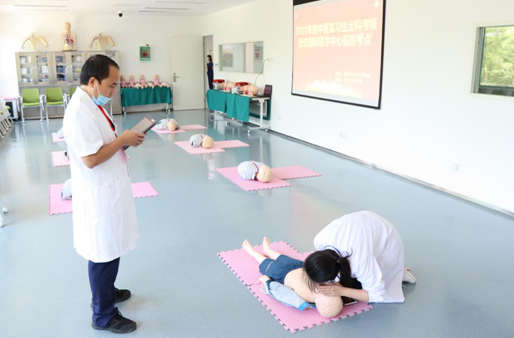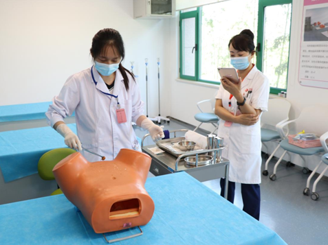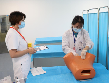 考核現(xiàn)場采用OSCE考站系統(tǒng),考生進入考場后確定考核項目,在模擬人上進行具體操作,考官根據(jù)學員操作與現(xiàn)場作答情況進行評分,整個考場井然有序。此次考核不僅檢驗了輪轉(zhuǎn)實習學員的學習效果,也達到了以考促學、以考促教的效果,促進臨床帶教水平和質(zhì)量不斷提升。