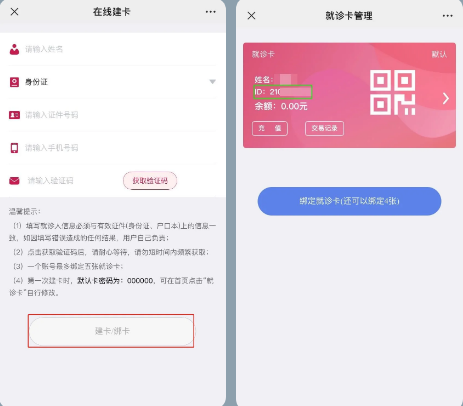 (1)沒(méi)有就診卡的人員,請(qǐng)輸入個(gè)人信息完成就診卡綁定。綁卡后,獲得個(gè)人ID號(hào)。(如右圖所示)
