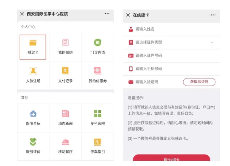 (2)沒有電子就診卡的人員,需輸入個(gè)人信息進(jìn)行在線建卡,建卡后返回診療服務(wù)頁面點(diǎn)擊【核酸檢測】,進(jìn)行核酸檢測預(yù)約并線上支付費(fèi)用。