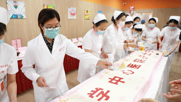 醫(yī)護(hù)餐廳為護(hù)理兄弟姐妹們精心準(zhǔn)備了60*400cm的蛋糕。“祝大家節(jié)日快樂!”李武平副院長、張敏主任及各科室護(hù)士長共同切蛋糕送祝福。