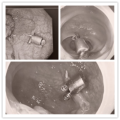 以其中一例乙狀結(jié)腸癌患者為例,因其病灶小且浸潤(rùn)深度表淺,腹腔鏡下難以精準(zhǔn)定位病灶。為達(dá)到微創(chuàng)及精準(zhǔn)切除病灶目的,賈宗良主任決定采取“腸腔內(nèi)病變磁體預(yù)標(biāo)記輔助腹腔鏡乙狀結(jié)腸腸癌根治術(shù)”。在磁鐵定位器定位的情況下,定位器與金屬器械之間產(chǎn)生吸力,從而精確定位病灶。術(shù)前張方信副院長(zhǎng)及唐華主任負(fù)責(zé)內(nèi)鏡下病灶定位,放置磁體定位器;賈宗良主任及苑海明主任醫(yī)師負(fù)責(zé)外科手術(shù),采取腹腔鏡手術(shù),順利為患者切除病灶。
