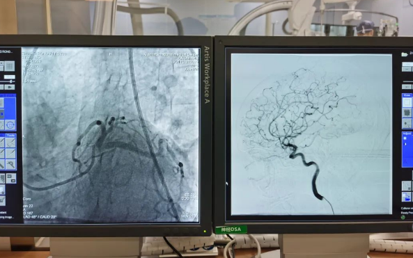 術(shù)前準(zhǔn)備就緒后,心內(nèi)二病區(qū)曾廣偉主任、高釗副主任醫(yī)師、神外科陸丹副主任醫(yī)師共同為患者行腦血管造影術(shù) 冠狀造影術(shù)。術(shù)后,朱奶奶恢復(fù)良好。