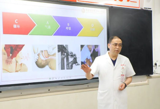 西安國際醫(yī)學(xué)中心醫(yī)院麻醉手術(shù)中心副主任王彬榮以“基礎(chǔ)生命支持”為主題,給老師們詳細(xì)介紹了現(xiàn)場急救、復(fù)蘇的定義和基本流程,并進(jìn)行現(xiàn)場演示。