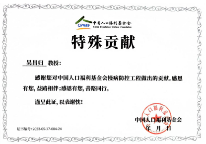 呼吸病藥物研究專委會(huì)一直高度重視呼吸慢病防控,鑒于吳昌歸院長(zhǎng)對(duì)呼吸慢病防控所做的貢獻(xiàn),中國(guó)人口福利基金會(huì)授予吳昌歸院長(zhǎng)慢病防控工程“特殊貢獻(xiàn)獎(jiǎng)”。