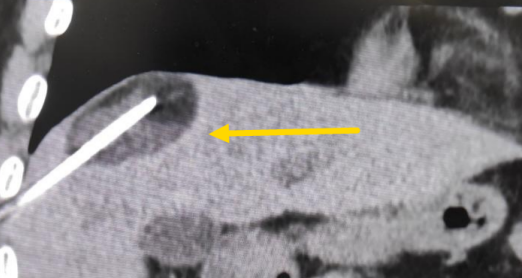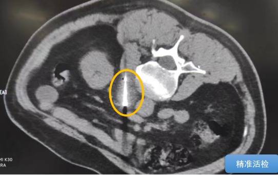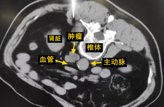 經(jīng)過(guò)多學(xué)科討論,陳寶瑩主任根據(jù)影像資料指出,患者轉(zhuǎn)移瘤位于腹膜后,內(nèi)側(cè)瀕臨人體最大的血管——主動(dòng)脈;前方同樣有血管緊貼腫瘤;外側(cè)是腎臟,后方是椎體和神經(jīng),夾縫中進(jìn)針難度大,治療時(shí)要避免周圍重要臟器、血管和神經(jīng)的損傷,因此可以選擇CT引導(dǎo)下精準(zhǔn)穿刺活檢同步冷凍消融治療,即獲得病理組織有利于下一步全身治療方案的調(diào)整,同時(shí)殺死腹膜后轉(zhuǎn)移瘤,周圍正常組織損傷的可能性也小。