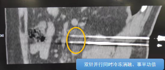 術(shù)中陳寶瑩主任、李鐵柱教授、兀云飛醫(yī)生、魏東紅技師、汝平護(hù)士協(xié)調(diào)配合,夾縫進(jìn)針難度雖大,但在CT引導(dǎo)下逐步進(jìn)針,精準(zhǔn)到位,順利活檢取得組織,由于腫瘤較大,為了提高消融效率,平行置入兩根冷凍消融針,同時(shí)啟動(dòng)冷凍消融,術(shù)中清晰觀察到冰球完全覆蓋病變,患者沒(méi)有任何不舒服,治療中還可以和醫(yī)生聊天。