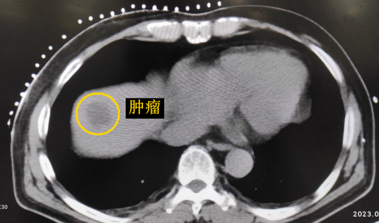 患者老年男性,曾于2021年行結(jié)腸癌手術(shù)。幾月前,發(fā)現(xiàn)肝臟轉(zhuǎn)移瘤,但沒(méi)有干預(yù)。近期CT顯示該轉(zhuǎn)移瘤明顯增大,并發(fā)現(xiàn)另一處轉(zhuǎn)移灶。