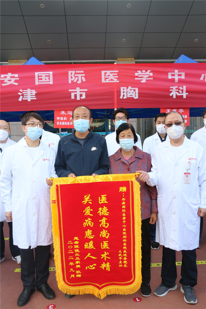 “朱院長、王主任,出院的時(shí)候我走的匆忙,沒好好謝謝你們,今天無論如何都要補(bǔ)上?!崩详愃蜕蟿倓傏s制好的錦旗,連聲道謝。