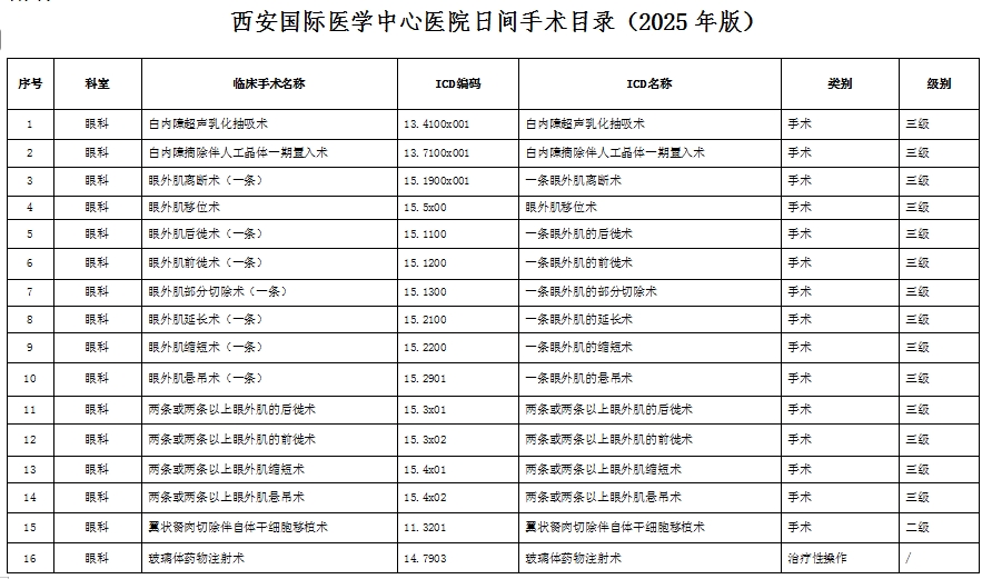 為進一步加強本院日間診療管理,規(guī)范日間診療服務(wù)行為,保障日間醫(yī)療質(zhì)量與安全,按照《醫(yī)療機構(gòu)日間醫(yī)療質(zhì)量管理暫行規(guī)定》、《手術(shù)質(zhì)量安全提升行動方案(2023—2025年)》、《提升醫(yī)療質(zhì)量安全行動計劃(2023-2025年)》等各類文件要求,現(xiàn)將本院2025年度日間手術(shù)目錄公示如下: