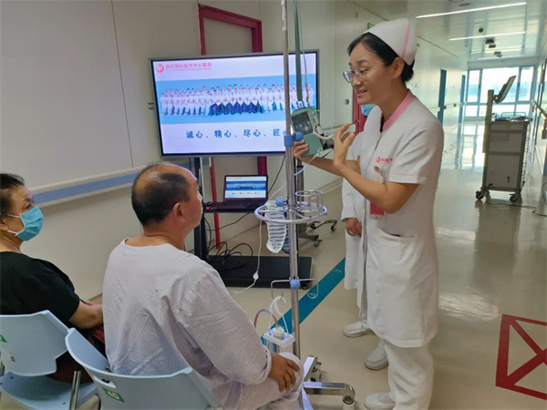 為了鞏固學(xué)習(xí)效果,胸腔外一科護(hù)士長李進(jìn)與患者進(jìn)行了互動問答,并再次耐心復(fù)述了可控式鎮(zhèn)痛泵的使用方法以及管路自我防護(hù)的要點(diǎn)。