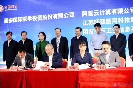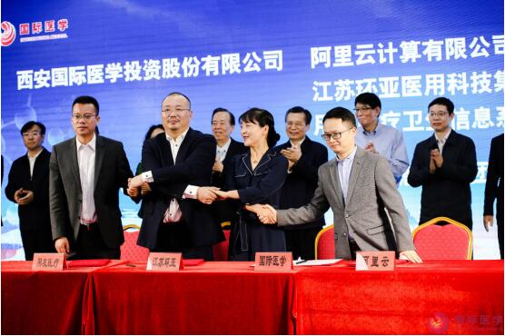 王永康書記等領導和嘉賓們首先參加了西安國際醫(yī)學中心的項目封頂儀式。在打造“ 一帶一路”國際醫(yī)療中心的啟動儀式上,國際醫(yī)學董事長史今代表公司與西安電子科技大學校長楊宗凱、英國國王學院代表簽訂《共建國際醫(yī)學院合作框架協(xié)議》;與阿里云簽訂《落地實施協(xié)議》、與江蘇環(huán)亞簽訂《信息化合作協(xié)議》、與用友醫(yī)療簽訂《信息化集團管控項目實施協(xié)議》。